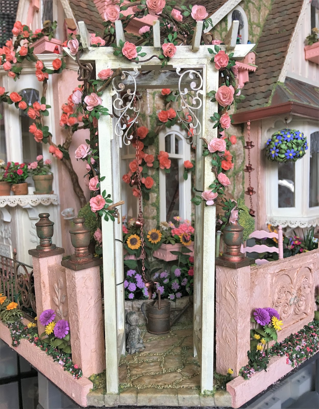 Thank you Marjorie! I am so glad that this garden happened around a Storybook cottage so that the amount of things going on here don't seem too over the top! It's a lot to take in, so a fantasy theme has allowed me to just let it develop without worry of being too unrealistic. The quantities of flowers was intensive, and at times I thought there would be no end! What a relief to have them finished, and to know any future flower making will seem easy in comparison!