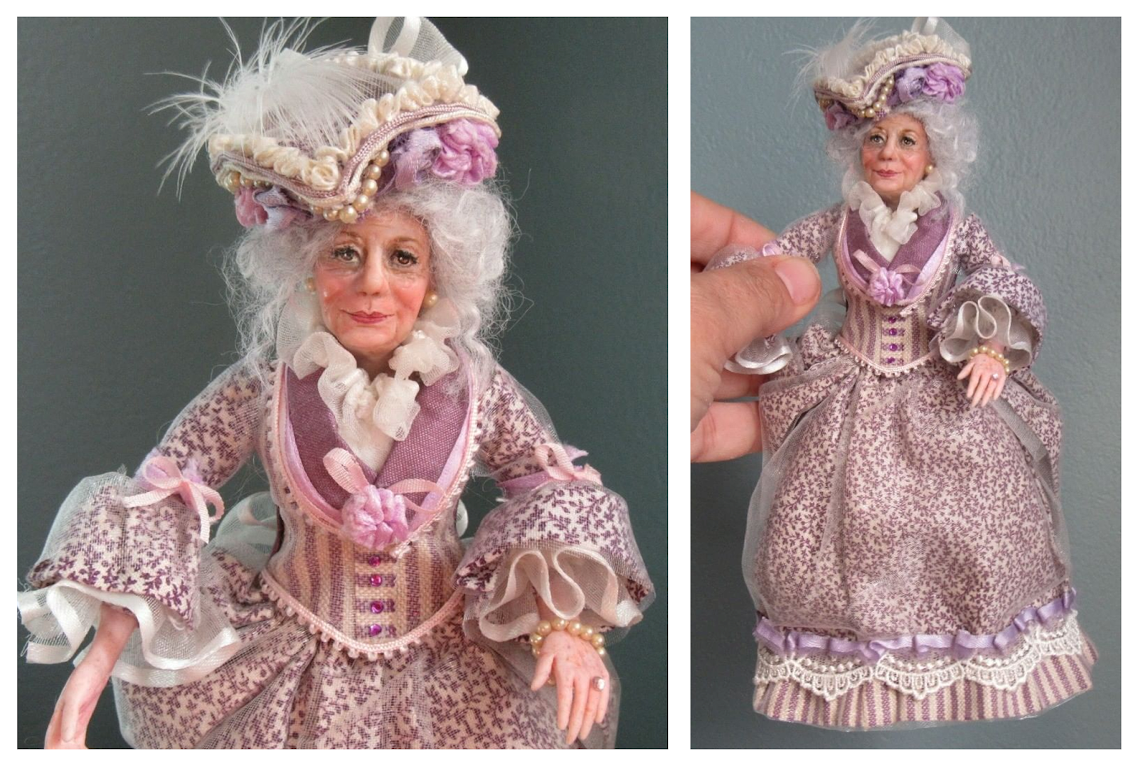 Her lovely white hair is viscose, curled with a hot rod. Her blue/gray eyes look animated and sparkle. Her elderly face is just full of character, incredibly detailed and sculpted by Pauline as a one-of-a-kind creation. You'll have to ask Pauline how she manages to get such a big soul inside such a small being.