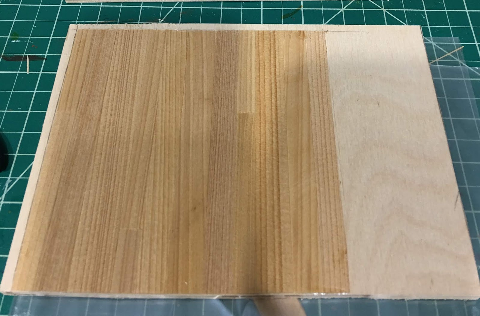 I started with the Mid Century Modern structure. I looked at my resources, drew up a quick sketch, searched online for some theme ideas, and then gathered some possible materials. For the base, I cut a piece of 1/4" plywood scrap down to 8-3/8" x 6-3/8". I used scrap 1/8" x 1/4" to trim the edges, then used leftover wood flooring for the interior part of the roombox. I had some Provincial Minwax Wood Stain Pen left over, so I decided that's what stain I'd use for all the wood in the project.