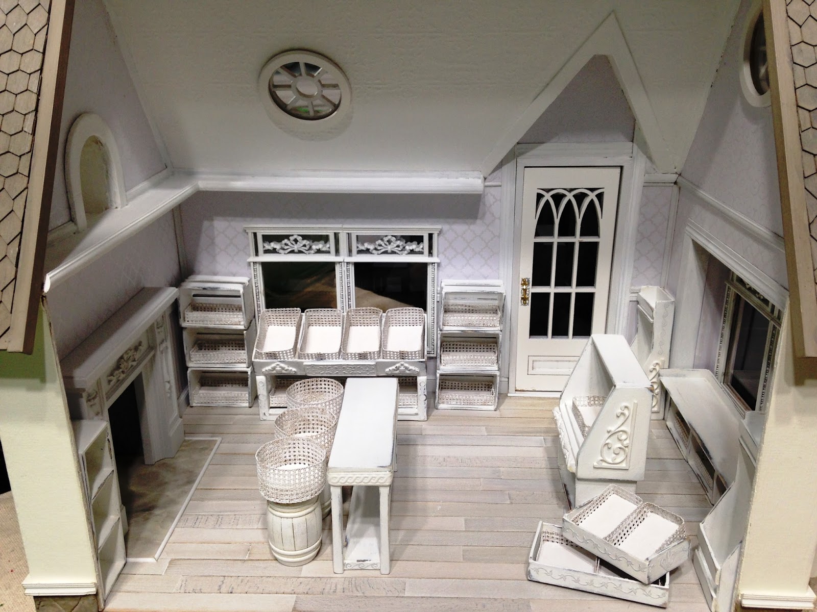 The Left and middle kits are REAL Old (probably about my age - not yet 50 but creeping up on it!) and they smelled like it, too! A test of the vegetable stand told me that I was going to need to make some alterations. As many of you know, the Sugarplum kit is on the small side of 1/12th! No worries! I cut down the legs, added slats (skinny sticks) on the bottom supports for shelving, and now it works perfectly under the front windows!