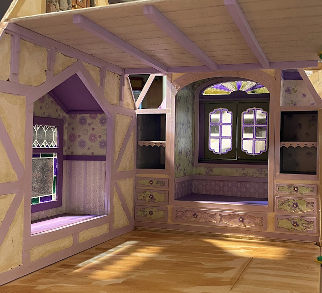 Here is another example of the potential adjustments that must be made if you decide to construct a dollhouse kit in your own fashion rather than following the instructions. My floor would no longer just simply slot into the tabs because of my "pre-fab" walls. No problem - now my floor slides in in two pieces: the bedroom section and the great room's balcony for the second floor, and Wayne's apartment floor and the catwalk for the third floor.